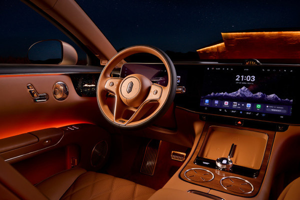 豪華配置層面,尊界S800車身尺寸達5480×2000×1542mm,軸距3370mm,提供行政四座與總統級空間布局。后排雙零重力座椅支持148.5°躺角調節,搭配43揚聲器音響系統與智能可變星空頂,營造沉浸式座艙體驗。車輛還配備電子外后視鏡、智慧電動門、隱私聲盾2.0等創新配置,整車手工工藝覆蓋水晶裝飾、金屬鑄造及皮質軟包等細節。
