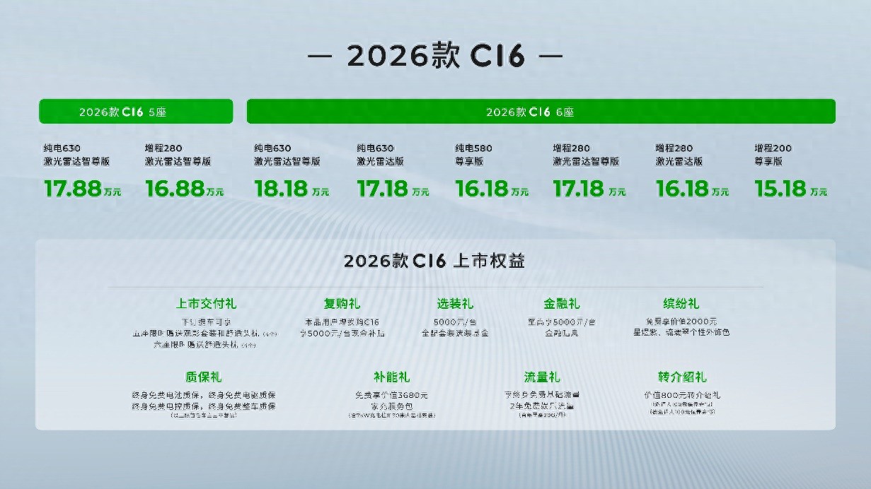 6月18日,零跑汽車正式宣布,2026款零跑C16正式上市并陸續開啟全國交付。新車定位“超舒適智能長續航SUV”,基于2024款全面進化,推出“冠軍6座”與“全新5座”雙版本,以70+項升級、超2.5萬元價值進階,打造“6口之家座座偏愛,5口之選座座超配”的全場景出行體驗。新車官方售價區間15.18萬-18.18萬元,即日起開啟預定。