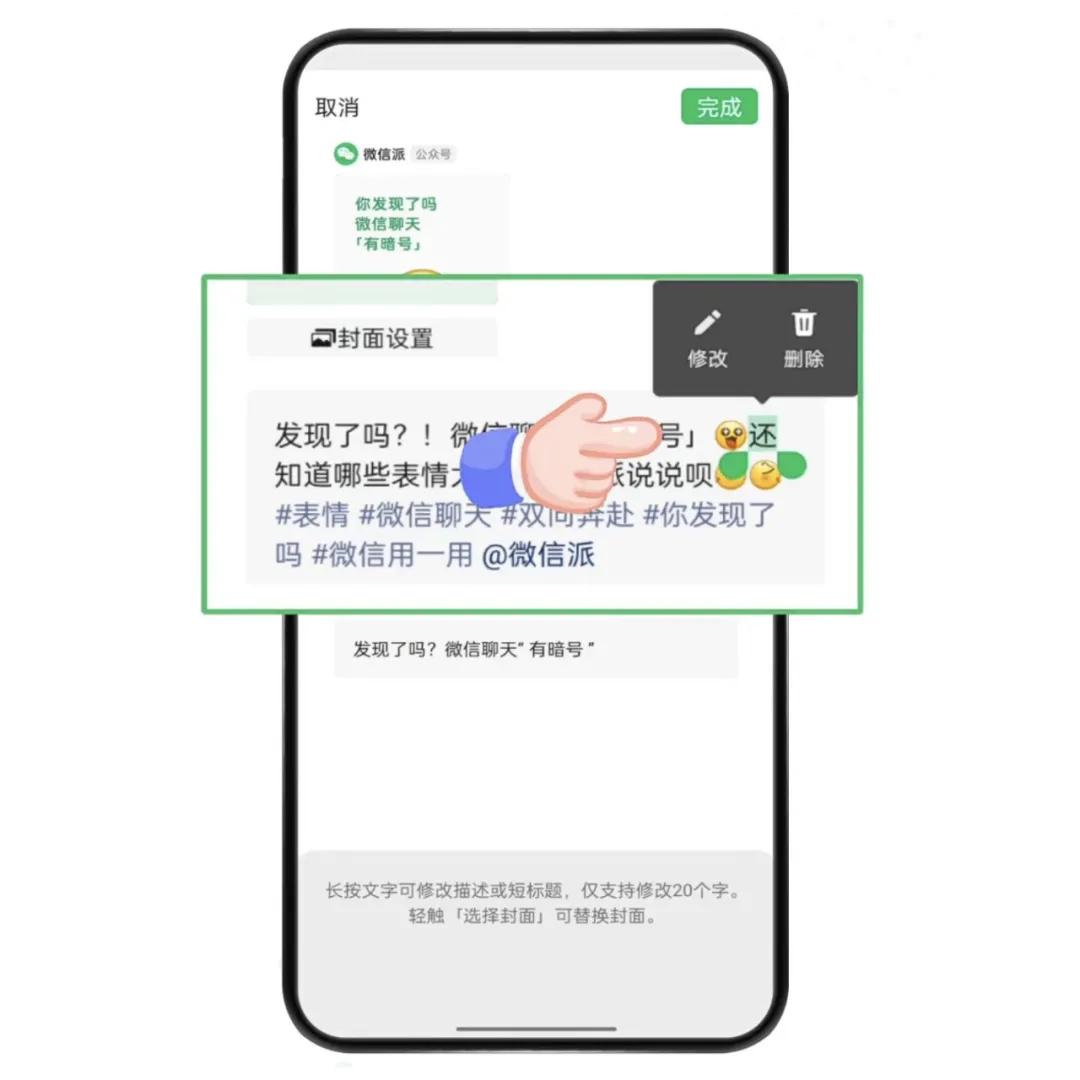 修改描述或短標題時,只需長按選擇你想要修改的文案,然后重新輸入相關文字即可替換,最多可以修改20個字。